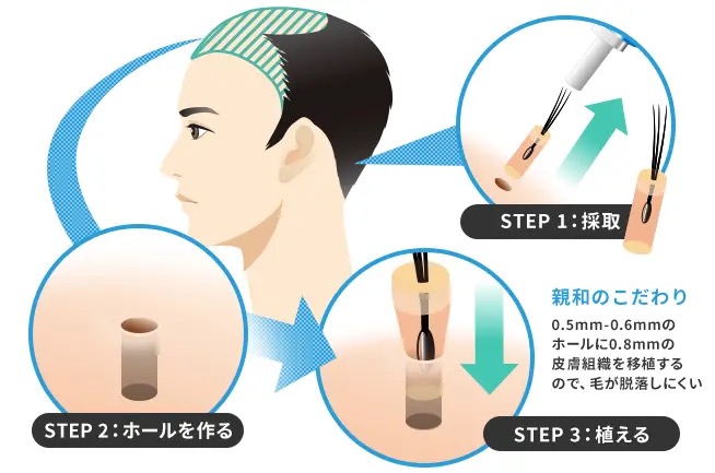 親和クリニックでは、以下の3ステップで自毛植毛手術を進めていきます。