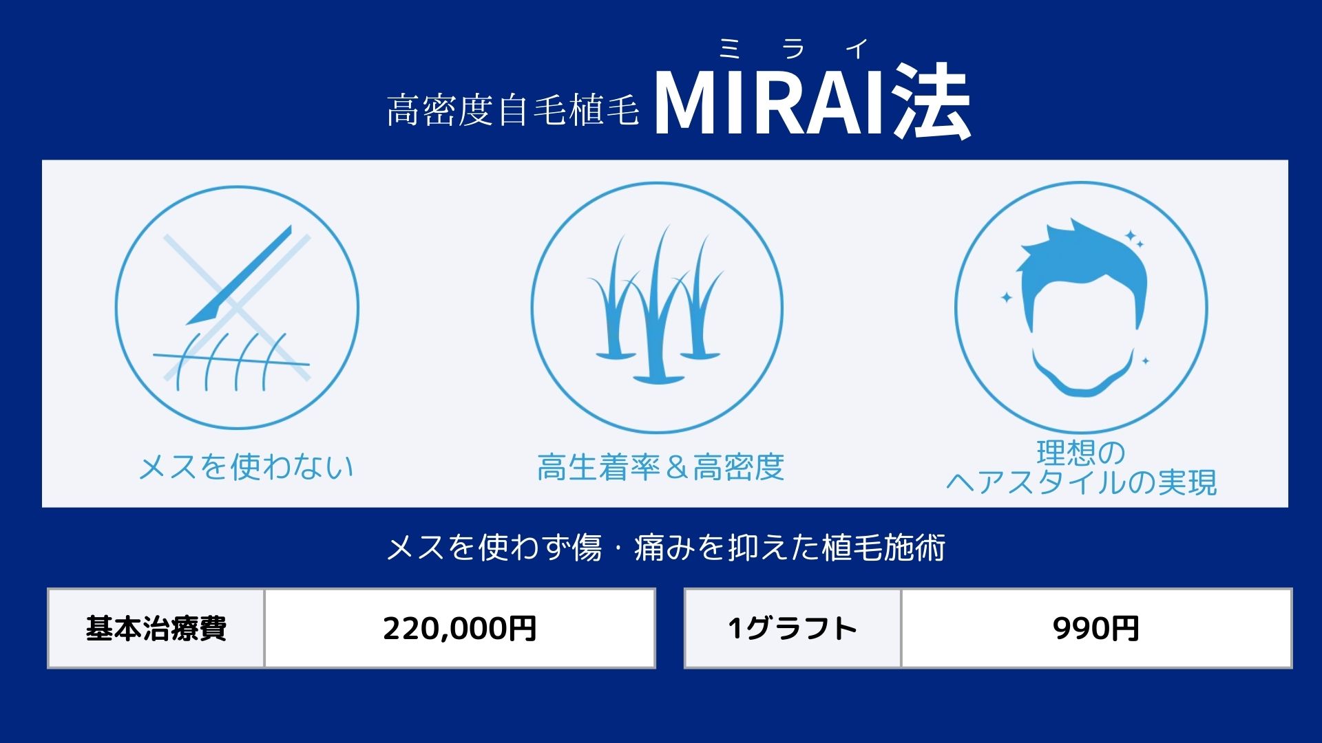 術後の傷跡はNC-MIRAI法と同様に目立たず、カバーシートをつける必要はありません。MIRAI法を部分的に組み合わせることで、コストも抑えることが可能です。