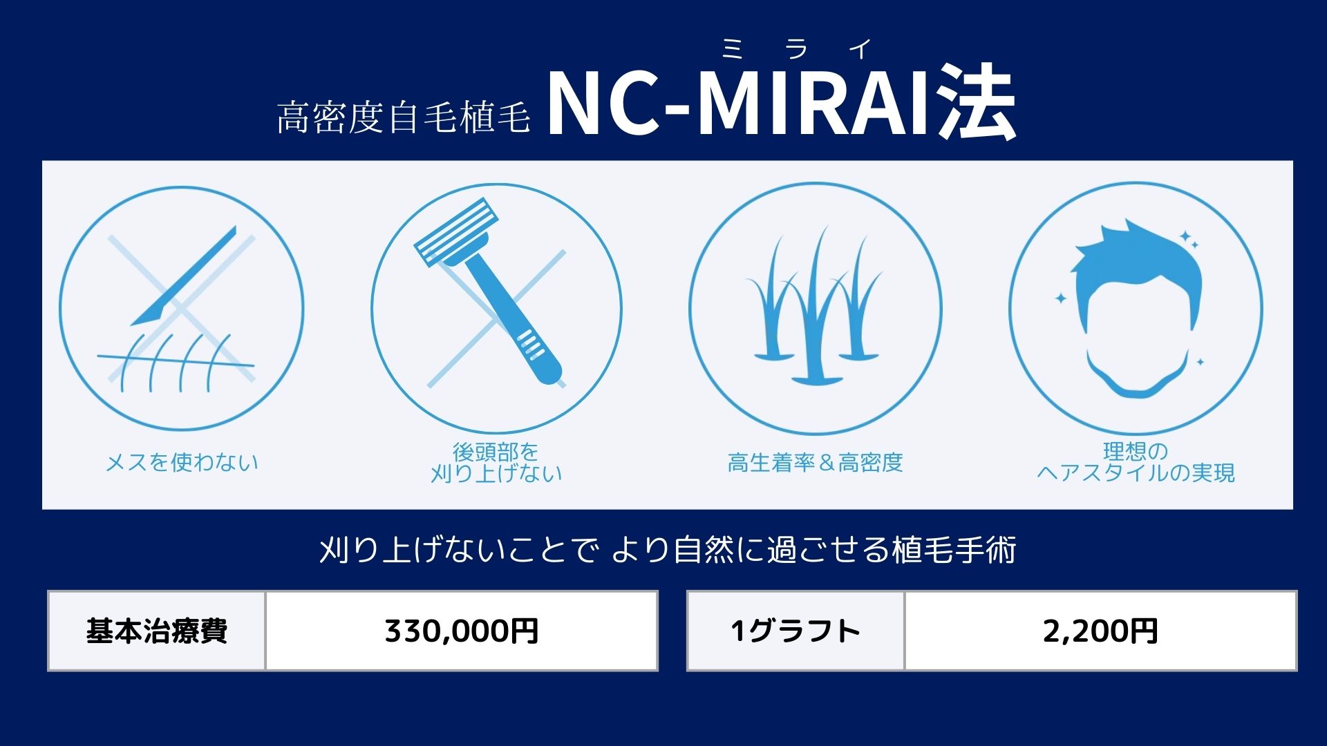 NC-MIRAI法は、後頭部をバリカンで刈り上げずに手術を行う親和クリニックの最新の術式です。 医師がハサミで1本1本カットしながら株を採取していくため、術後もヘアスタイルの変化がなく、傷跡をご自身の髪の毛で隠すことができる方法です。
